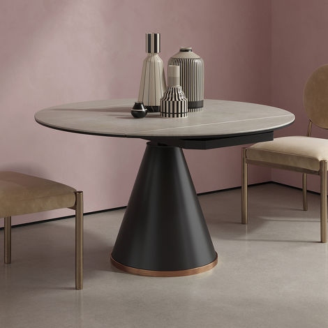 Обеденный стол раздвижной, отделка закаленное стекло с керамикой, черный металл, декор розовое золото, коллекция