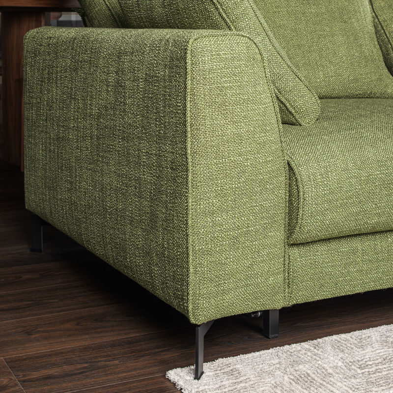 Каркас дивана изготовлен из металла и МДФ. Наполнитель подлокотников и царги эластичный ППУ плотностью 25 и 22 кг/м3 и дополнительно обернут холотеком плотностью 100г/м2.