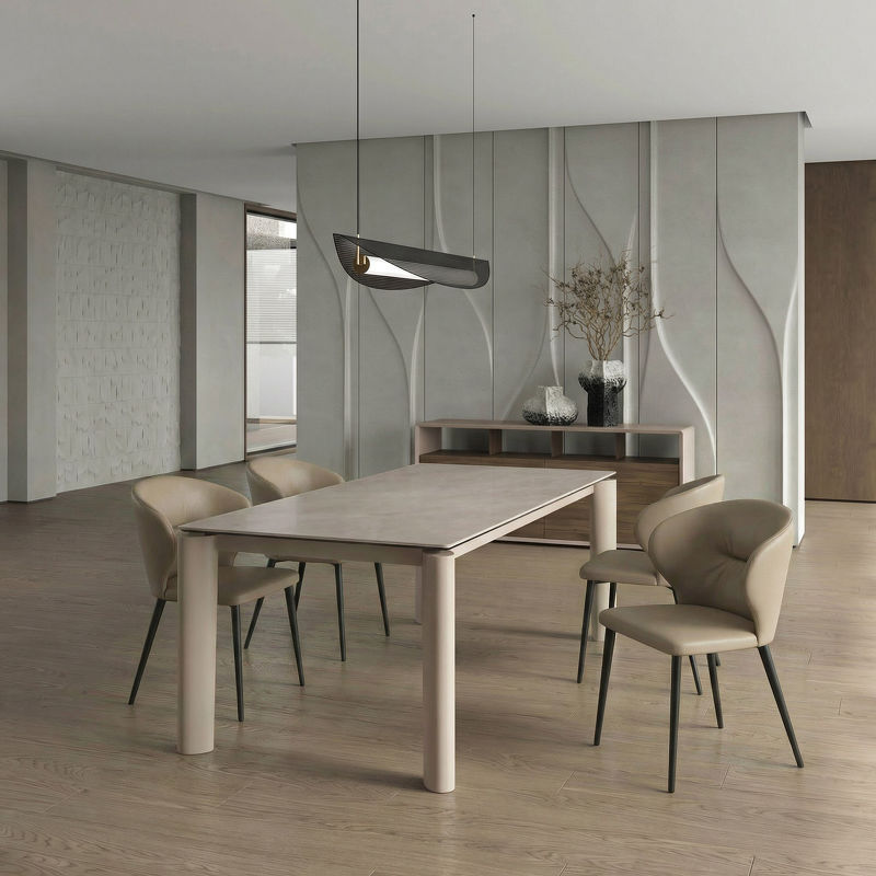 В основе — безупречная геометрия. Столешница — тандем закалённого стекла (8 мм) и высокопрочной керамики (3 мм). Это поверхность, которая не боится жизни: ни горячей посуды, ни нечаянно оброненной вилки, ни следов от детских ладоней. Она матовая, тёплая и удивительно тактильная. Никакой холодности — только благородная глубина.