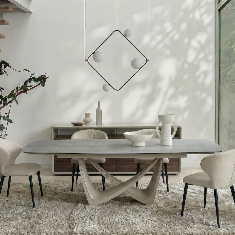 Стол является центром внимания в столовой. Его футуристичное основание из высококачественного металла с бежевым порошковым покрытием - это скульптура, на которой покоится идеально гладкая столешница из спеченного камня (12 мм). Этот материал невероятно прочен, стоек к царапинам и нагреву, а его матовая поверхность выглядит дорого и тактильно приятна.