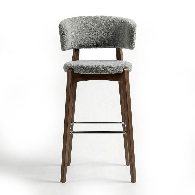 Полубарный стул Оделис (Odelis) с комфортной поддержкой спины, благодаря закруглённой спинке. Каркас и ножки стула выполнены из массива бука, в отделке итальянский орех. Сидение - из МДФ высокой плотности. Спинка - многослойная фанера. Обивка - ткань в серых тонах. Подножка - нержавеющая сталь.